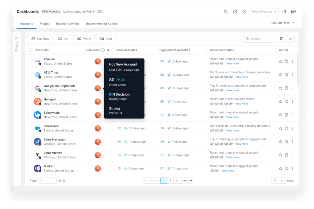 6Sense also features ‘RevenueAI’, a sales intelligence tool that predicts buying stages and scores accounts based on their likelihood to convert. Complementing this is the ‘Next Best Action’ feature, which uses AI to recommend optimal outreach strategies, enabling sales teams to prioritize high-value accounts effectively.