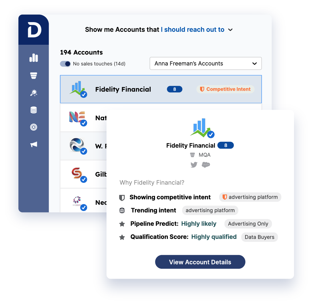 Sellers often do not know where to focus their outreach efforts on a daily or weekly basis. This dashboard prioritizes the accounts that matter to the individual salesperson. Using Pipeline Predict Scores, Qualification Scores, engagement, intent, and news events, the Prescriptive Sales Dashboard ensures that sellers always know the best accounts to target on any given day based on a combination of insights that indicate their readiness to buy.