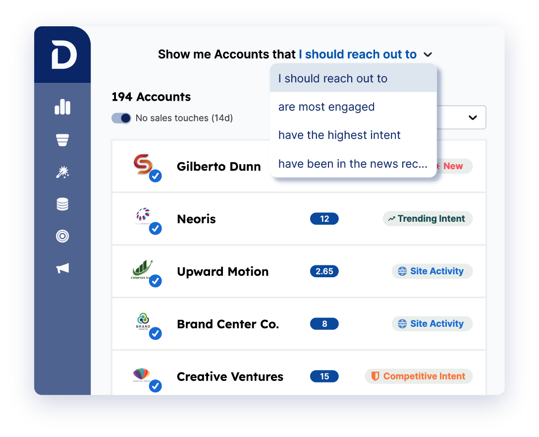 “Show me accounts I should reach out to,” is the straightforward prompt that stack-ranks a list of accounts showing exactly that, the accounts you should reach out to… and tells you WHY. Then you just start at the top with the accounts showing the most buying signals and work your way down.
