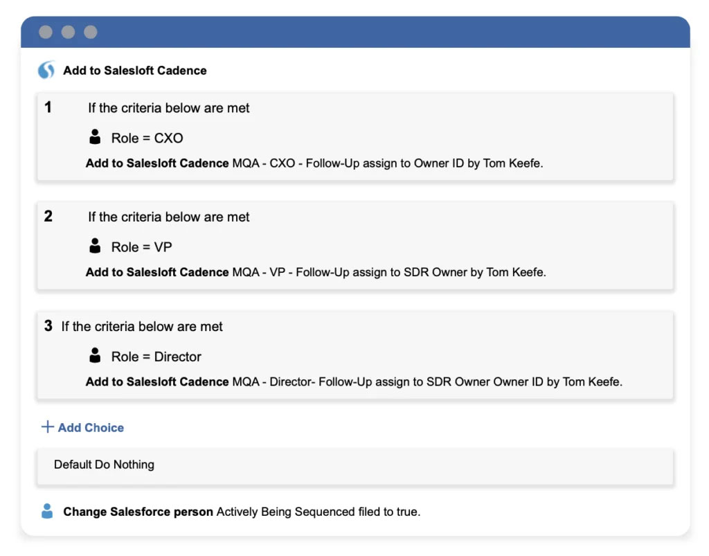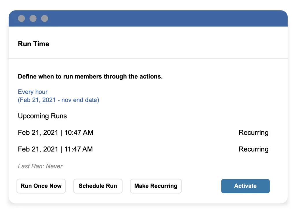 Batch: Batch plays are run against a list of accounts or people. Just as you’d build a list of people in marketing automation, here you select the exact group to target, then launch the action sequence to the entire list at the scheduled time.