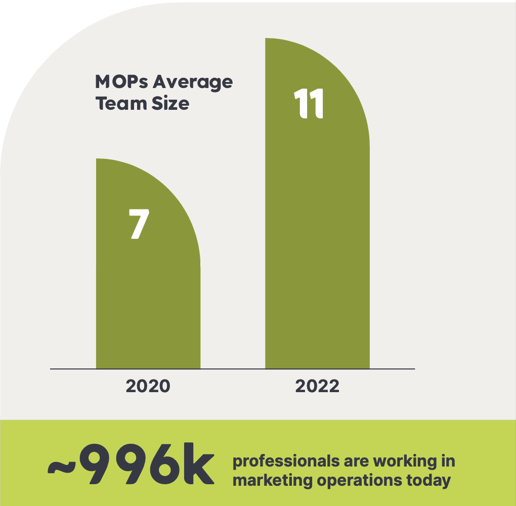 You’re not the only one on the hunt for new members of your MOPs team. In just the last two years, the average marketing operations team grew by two-thirds, from 7-11 people, with teams in companies of 10,000 people or fewer seeing their MOPs headcount double.