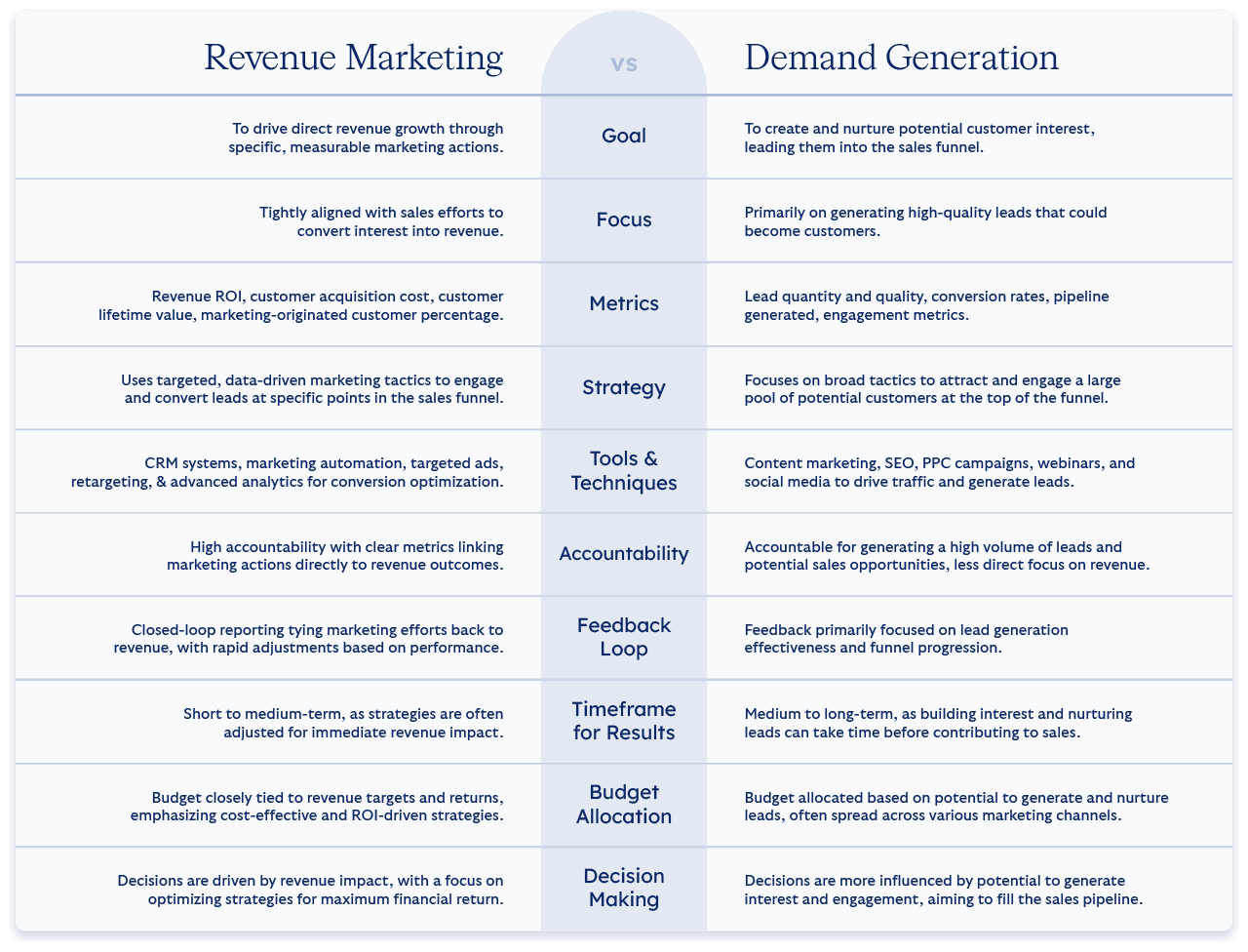 Key Note → While demand generation sets the stage for broad market engagement, revenue marketing refines this approach by directly linking marketing efforts to financial outcomes. A successful strategy often integrates both, with demand generation filling the pipeline with qualified leads and revenue marketing optimizing these opportunities to maximize revenue.