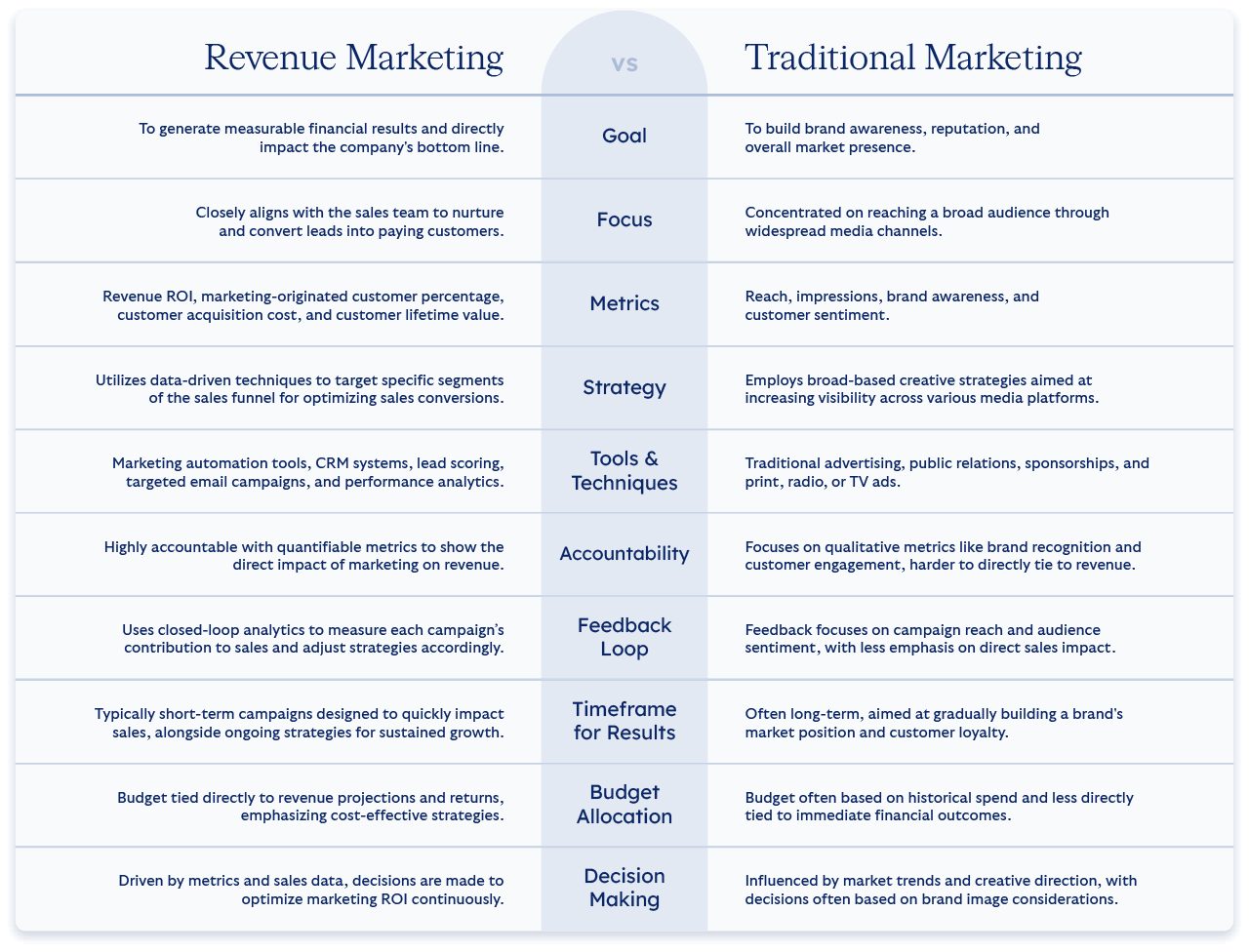 On the other hand, revenue marketing emphasizes bottom-line results, i.e., generating tangible financial outcomes directly from marketing efforts. This approach aims to not only attract leads but also convert these leads into revenue-generating customers.