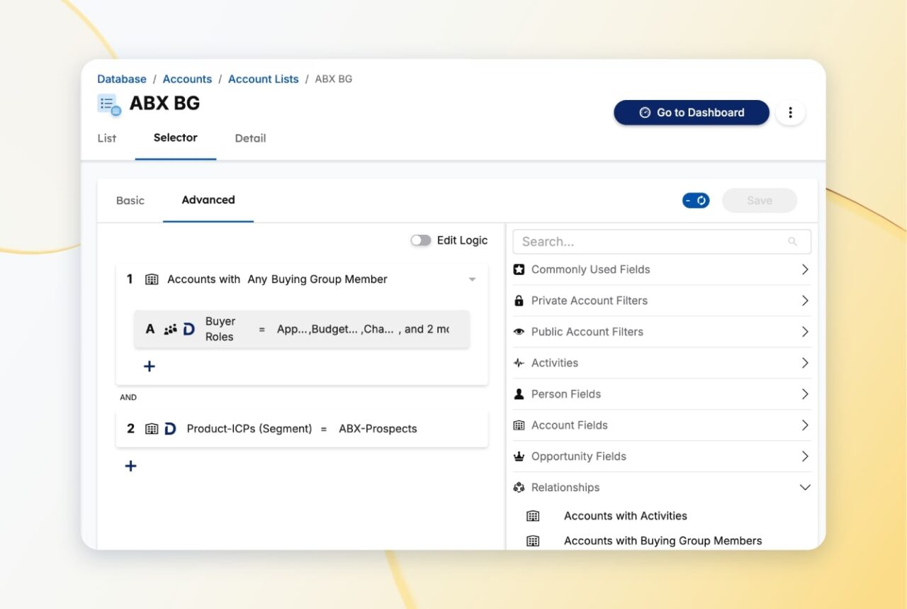 Build your target account list using Basic Selectors, for use across different engagement channels.