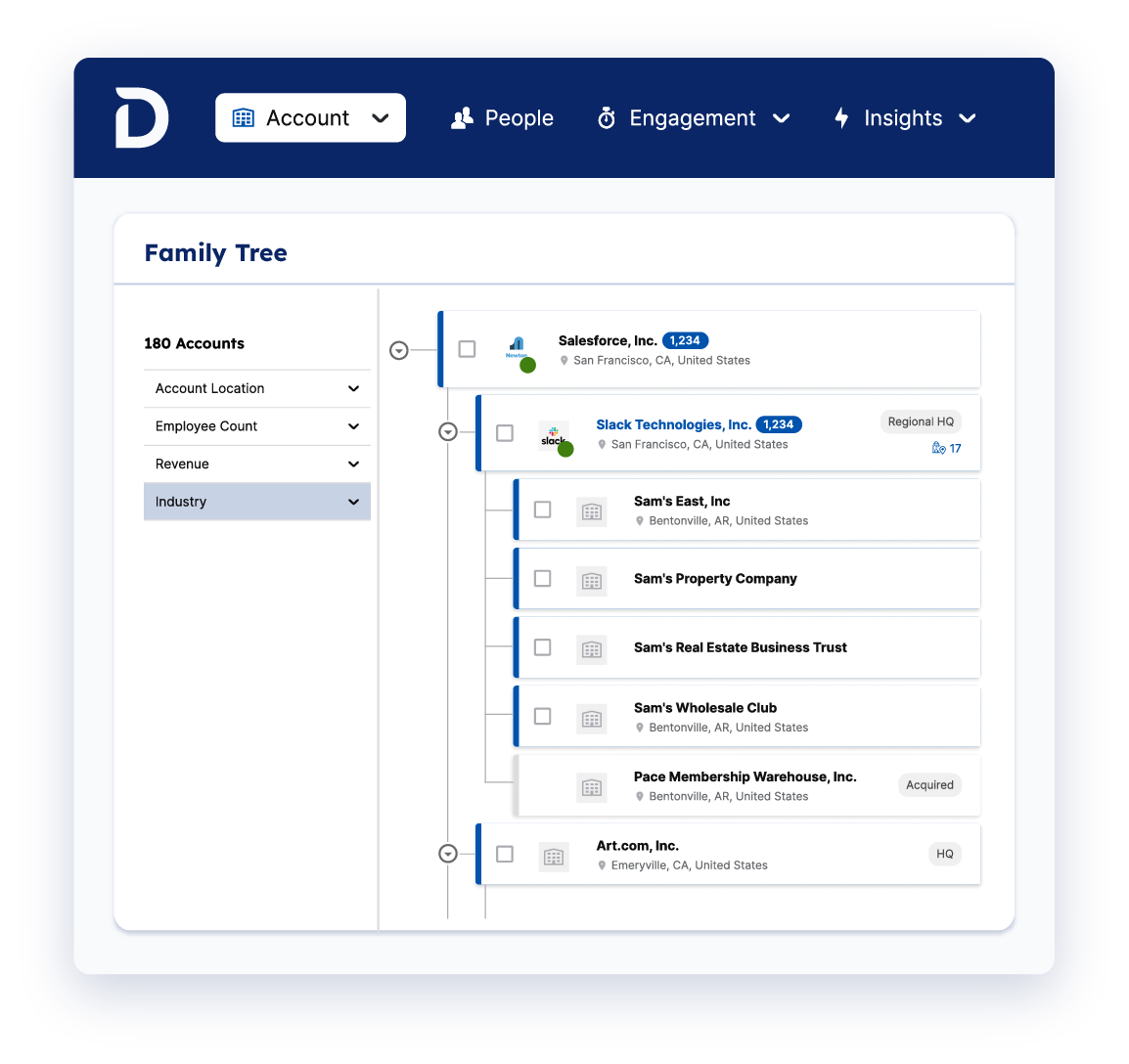 Account hierarchies (aka family trees) shouldn’t just show you how companies are connected — they should help you make decisions that drive revenue. Demandbase automates account hierarchies so sales and marketing teams can sharpen their focus. Automatic family tree linking makes it easy to: