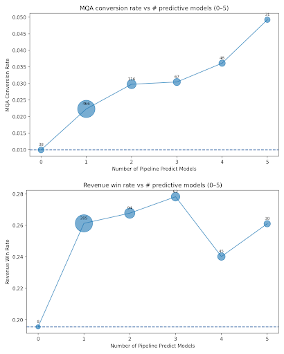 Labs research shows a similar relationship with predictive scoring depth. As additional predictive models are activated, conversion probability and closed revenue rates increase (see below). Broader predictive coverage improves prioritization, timing, and execution consistency.