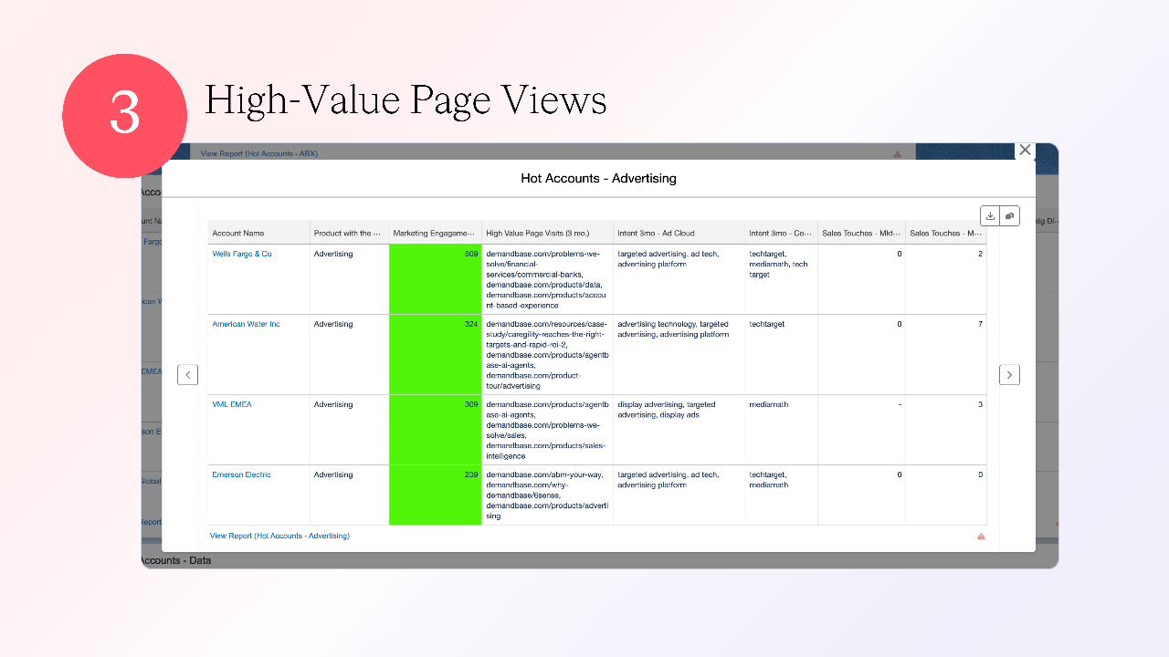 • Purpose: Highlight accounts engaging consistently with high-conversion potential pages (e.g., case studies, whitepapers).