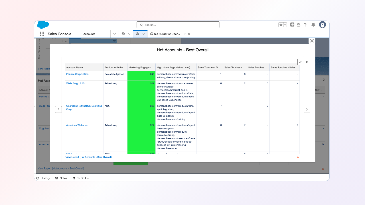• Hot Accounts: Surface priority accounts ranked by engagement, product interest, and persona activity.
