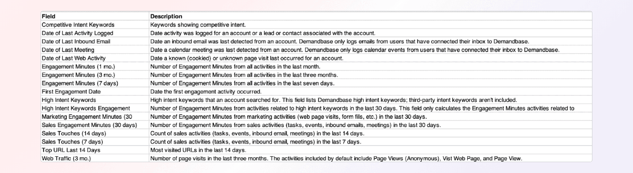 • Competitive Intel Leads: Accounts demonstrating interest in competitors, renewal dates, or review sites.