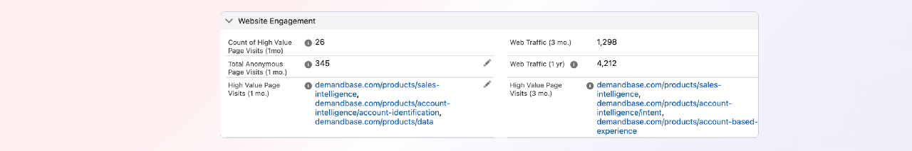 • High-Value Page Views + Intent: Monitor visits to pages like case studies, pricing, and demos.