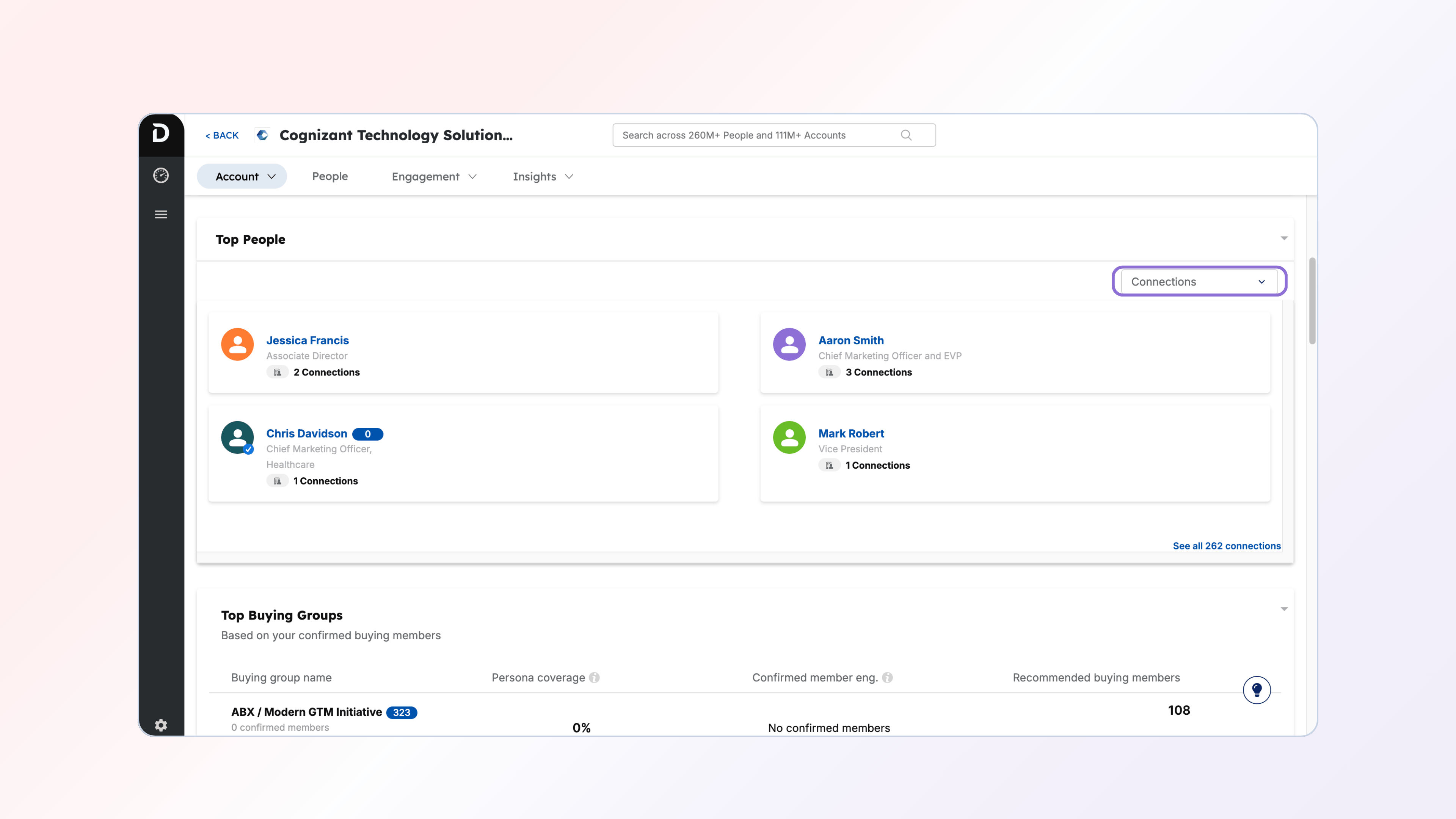 - Access Buying Group Insights: Navigate to your active accounts in Demandbase. Use the “Top People” section to review recommended members of the buying group.