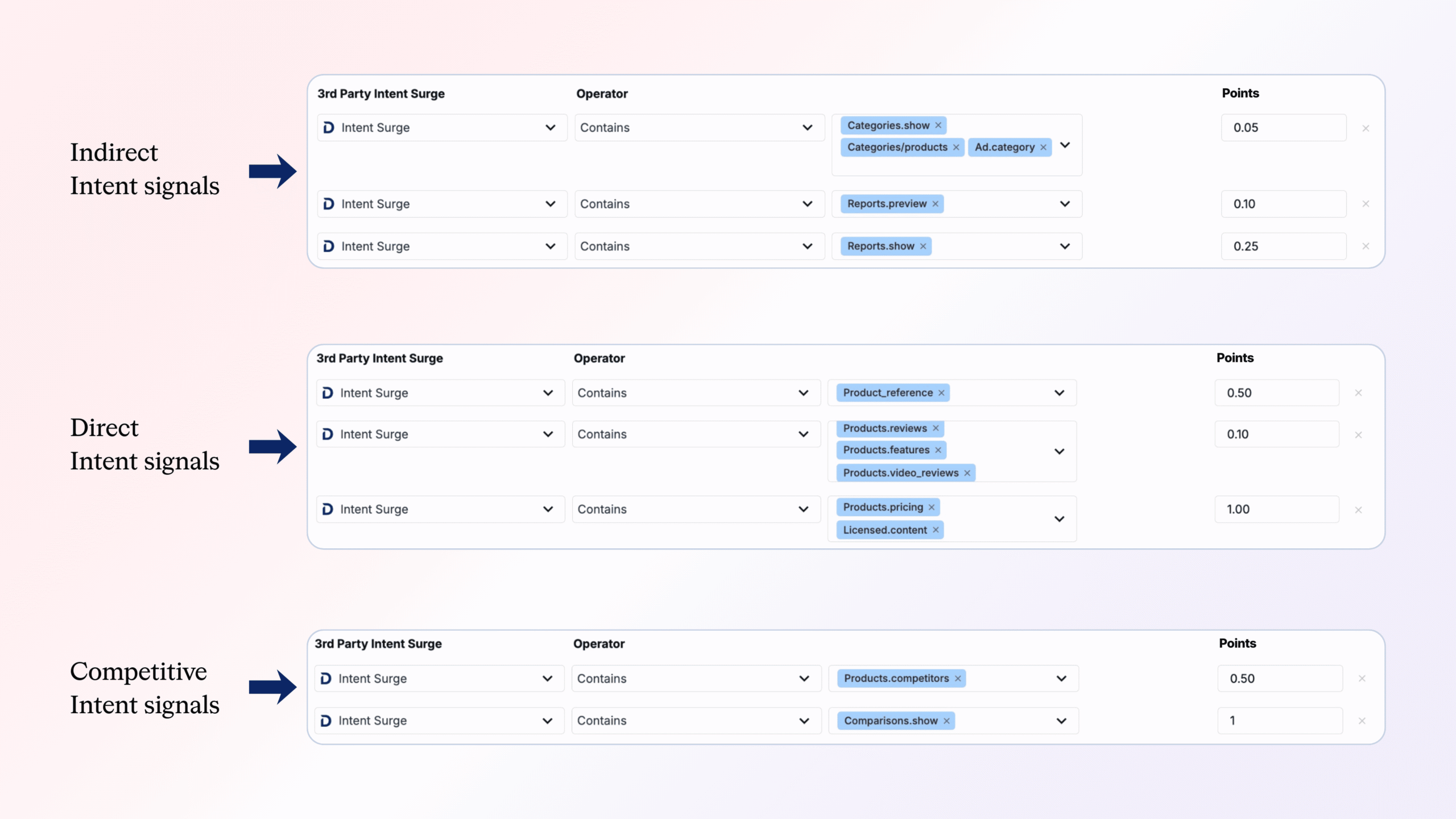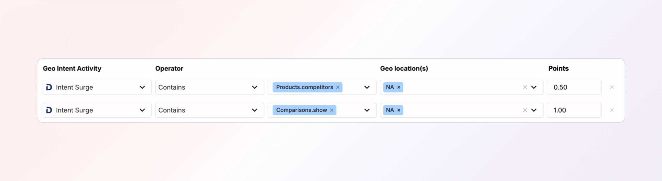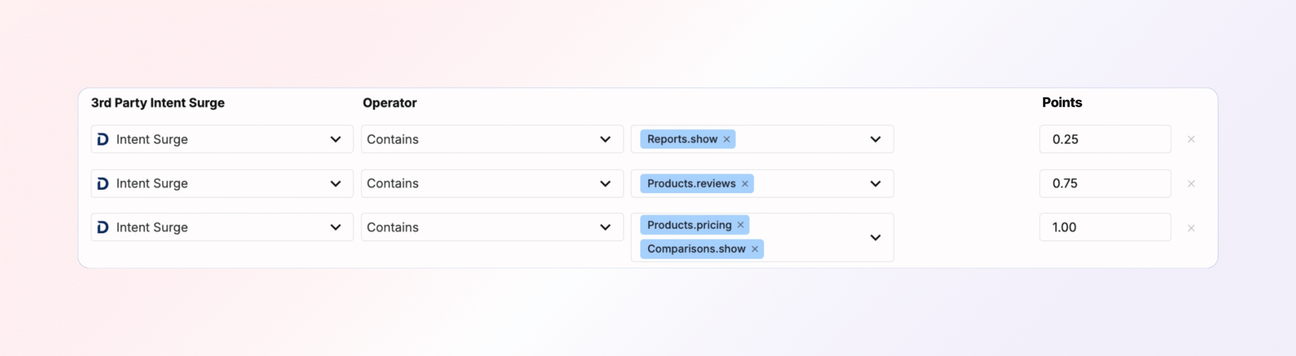 These values reflect that direct and competitive intent signals carry more weight because they show deeper buying behavior.