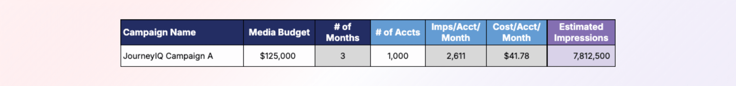 • For JourneyIQ: one budget across all stages; plan ~ 2,500–3,000 impressions/account/month