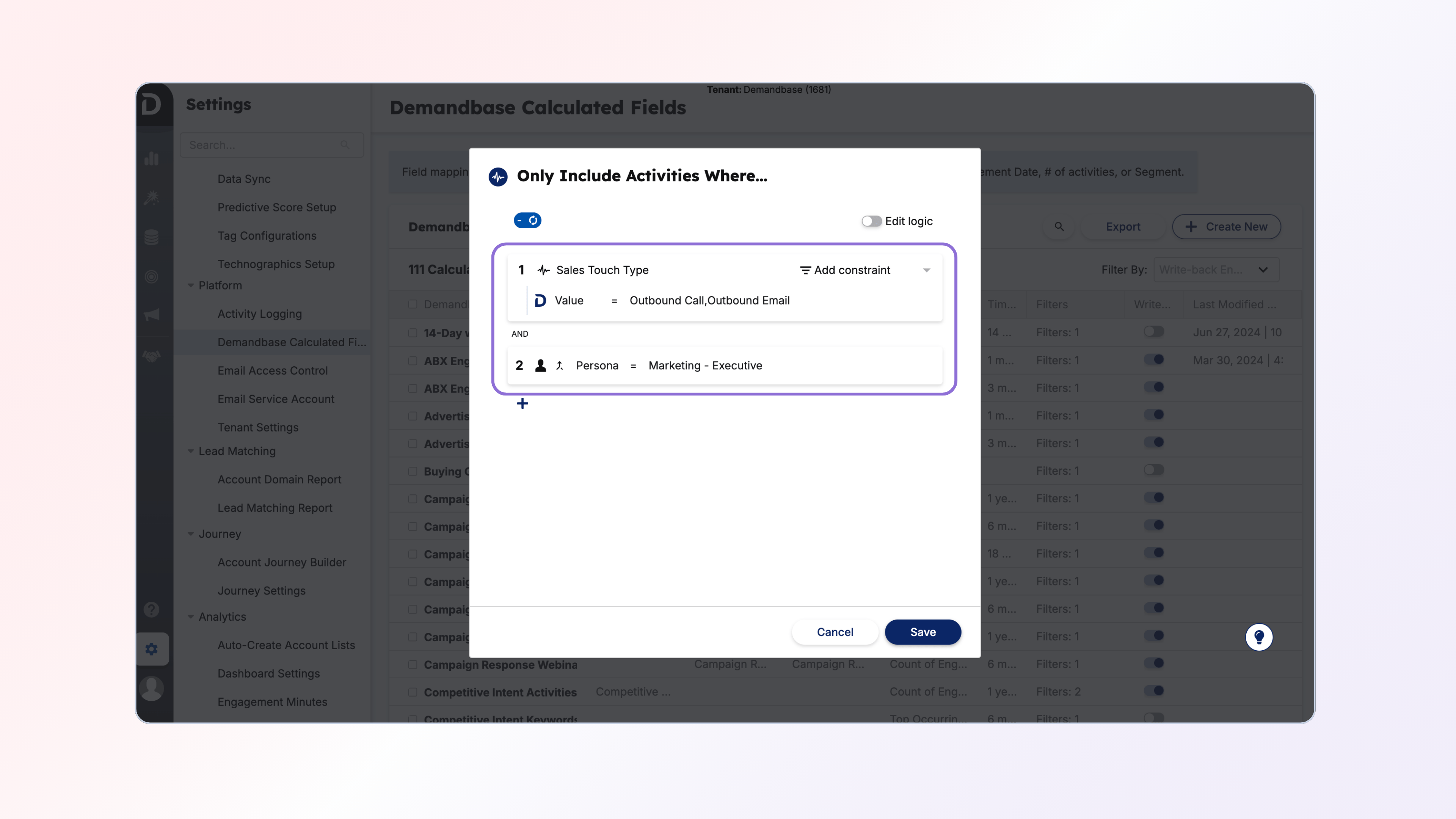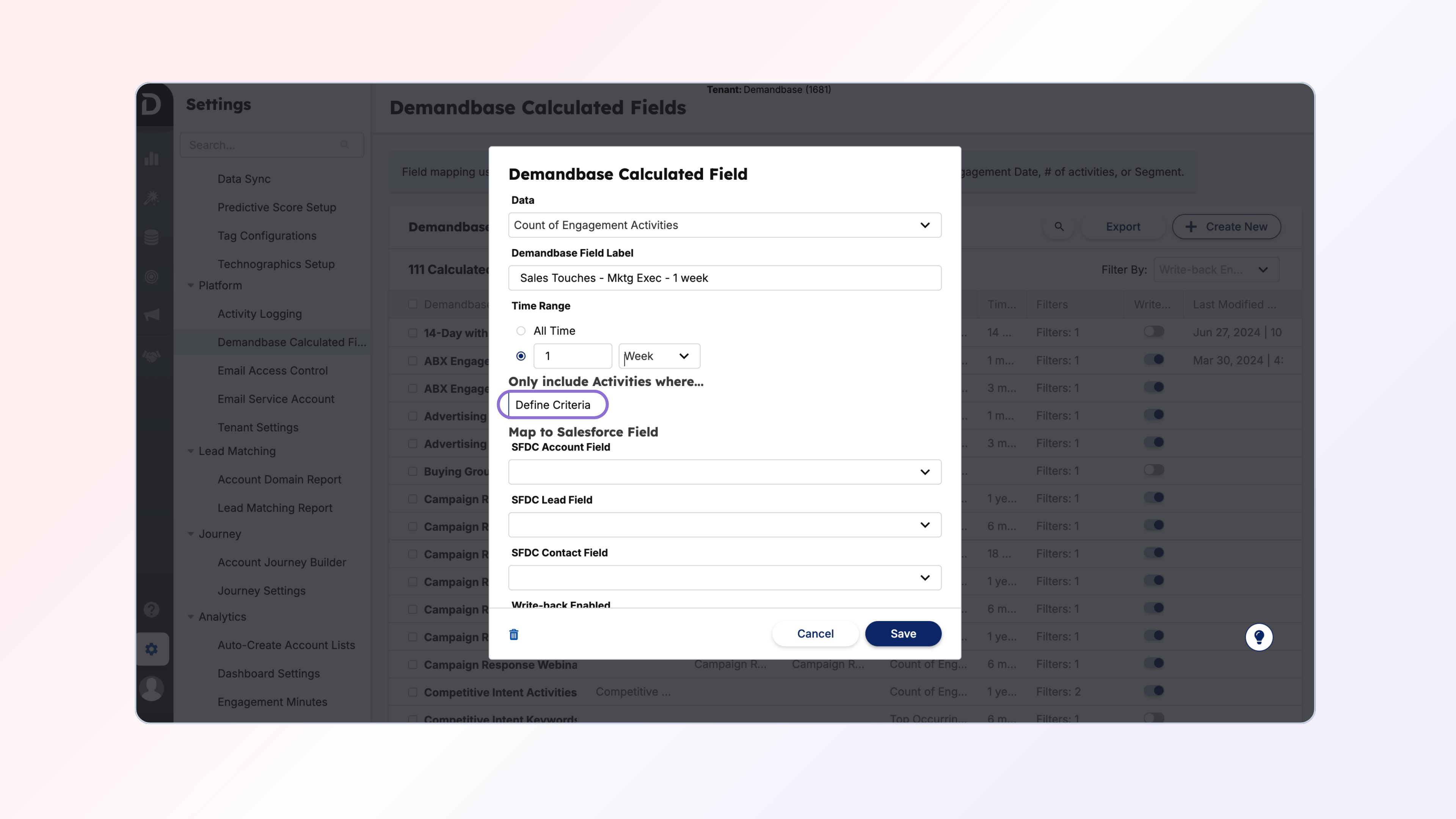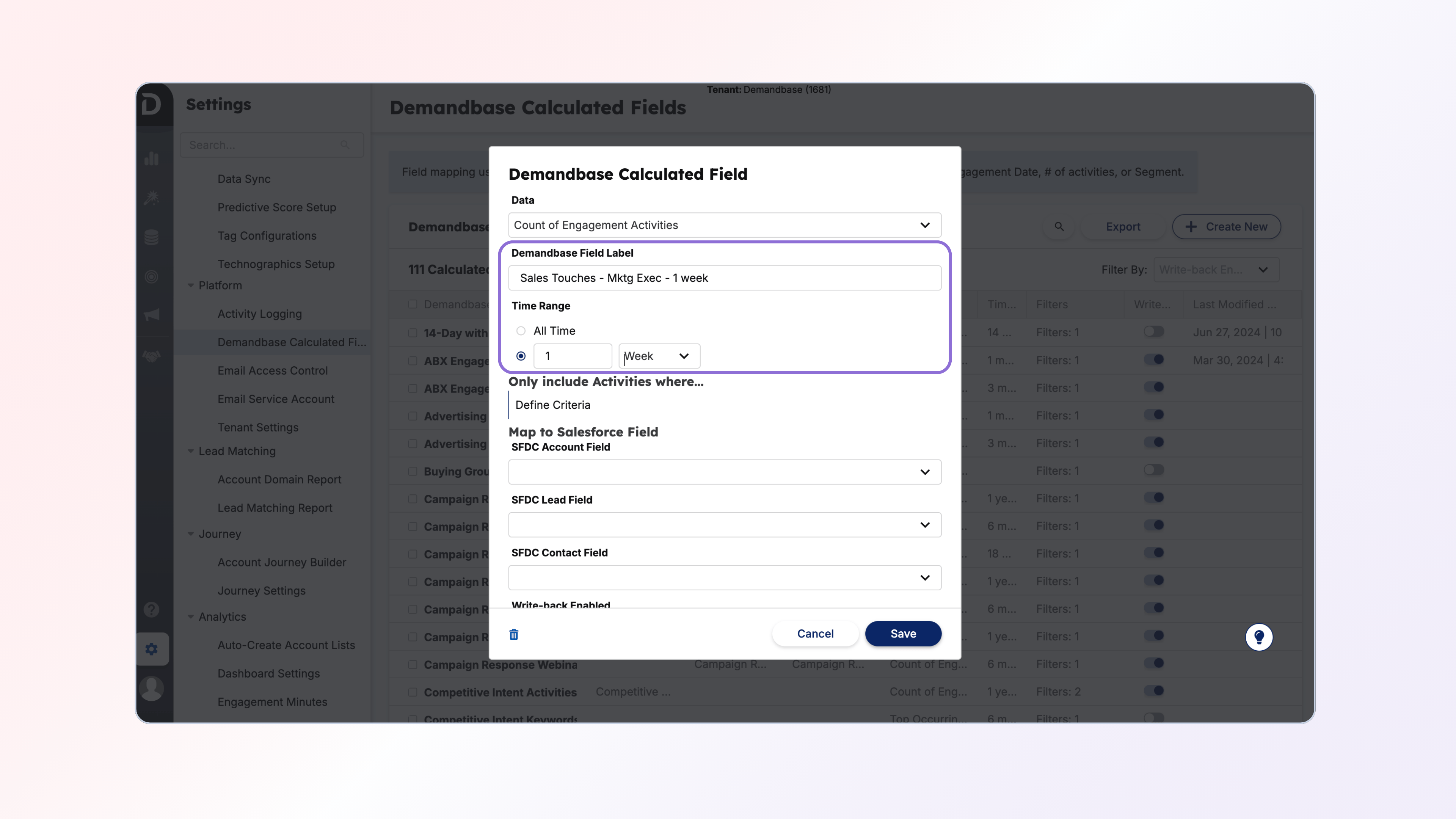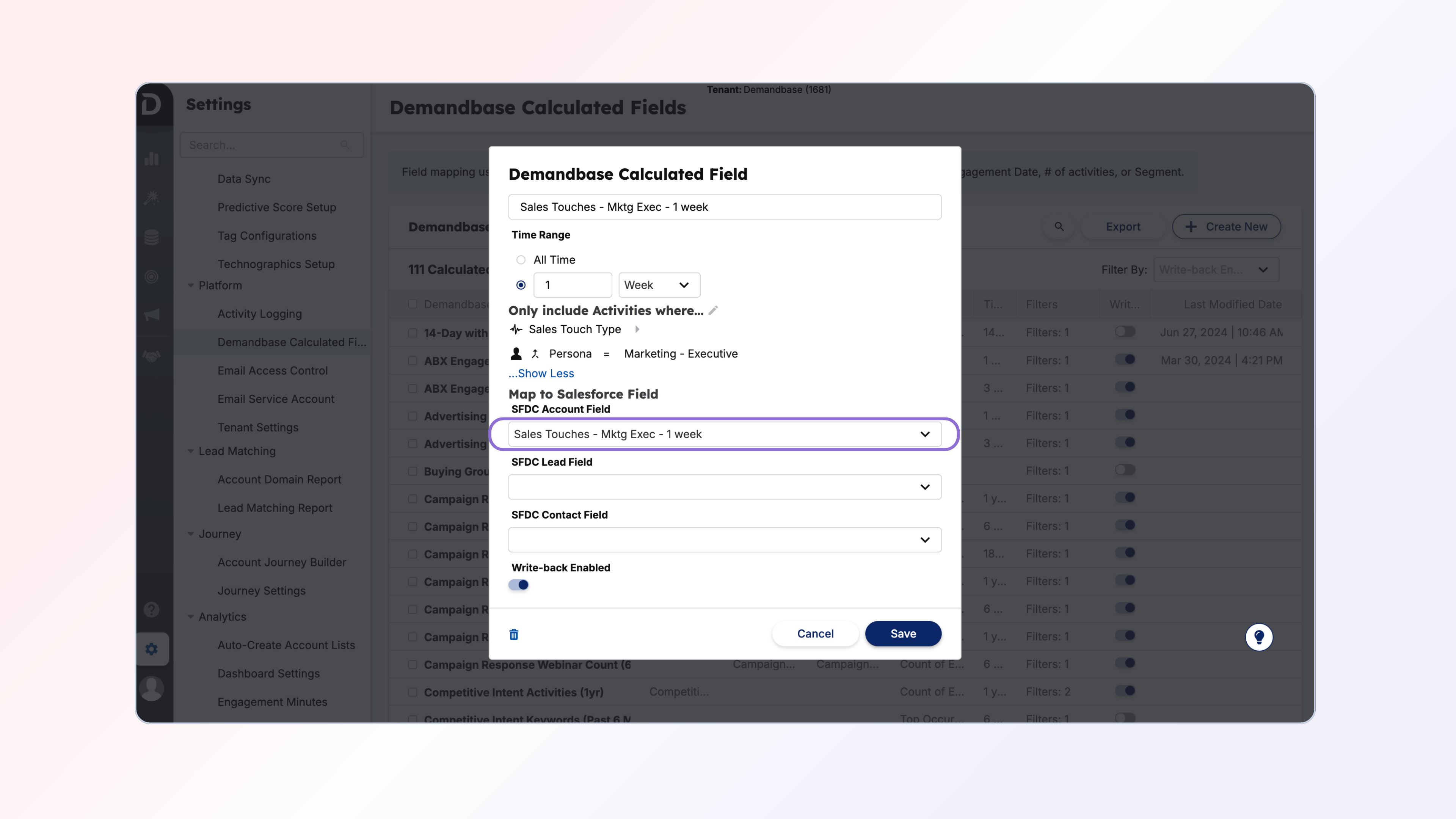 One thing that you should align with both your Marketing, Sales and Operations team on is what is the timeframe you want to track this Sales Touch data within. Most customers usually start with 1 week, however as they mature we see that expanded to 2 weeks and 1 month. For example, using one week would tell you “how many sales touches did X Persona receive over the last 1 week”.