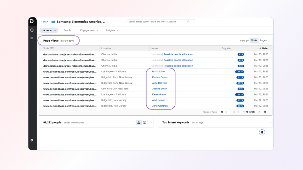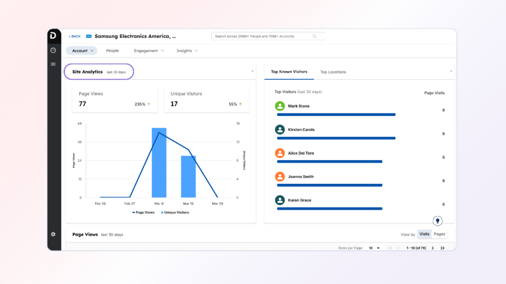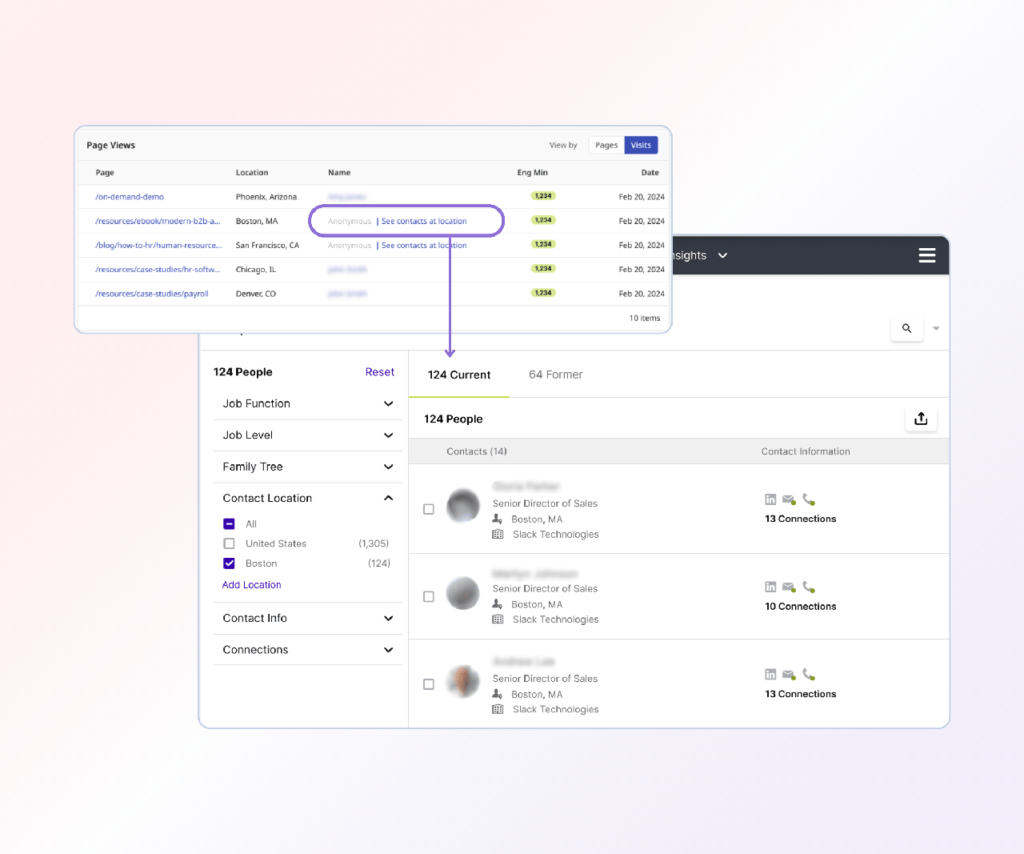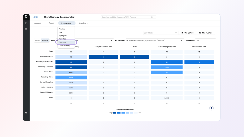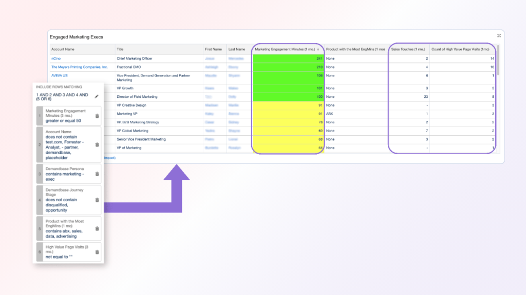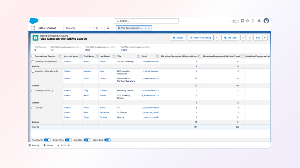 These reports can be built for individual accounts, target personas, or across a sales representative’s territory. They should show: